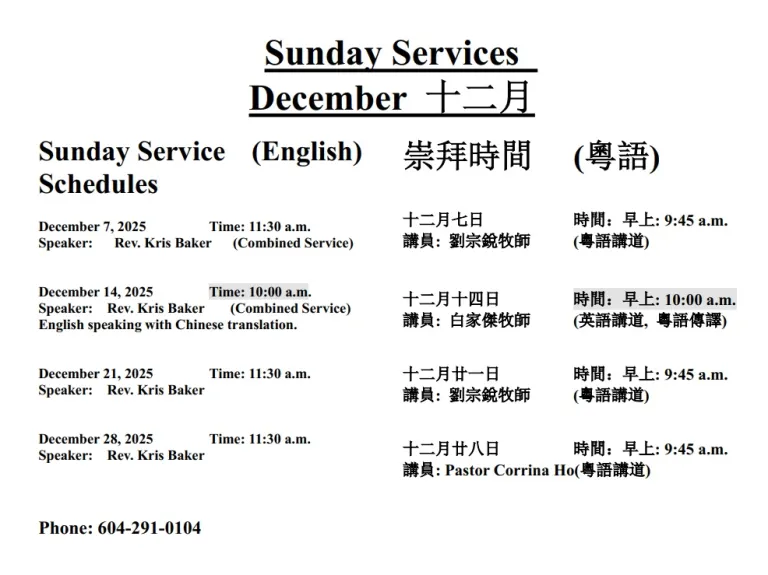 9:45 AM (Cantonese) and 11:00 AM (English); or